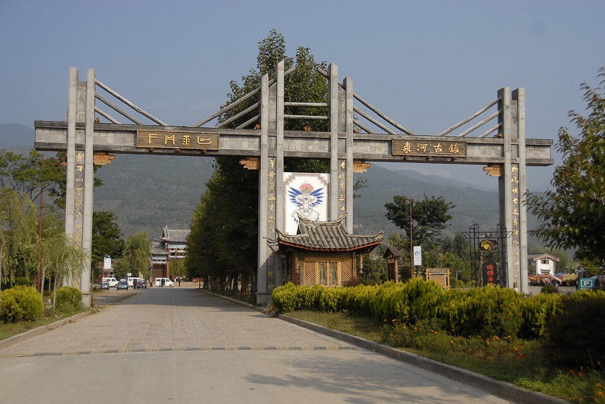 麗江束河古鎮景區東巴象形文字寨門位于束河古鎮南門收費站